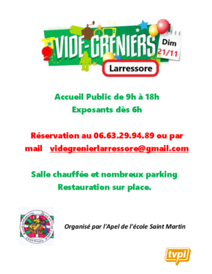 Réservation au 06.63.29.94.89 ou par mail : videgrenierlarressore@gmail.com