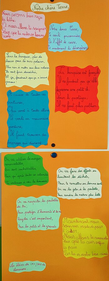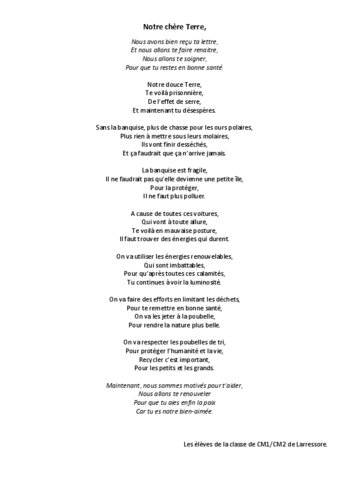 C'est un projet "PAC" (projet d'action culturelle) élaboré avec la communauté des communes, pour lequel l'école va recevoir une aide financière de la DRAC et de la communauté des communes. Le thème tourne autour des progrès et des revers du monde contemporain, de l'écologie,... Issue d'une oeuvre littéraire "La Terre qui ne voulait plus tourner"de Françoise du Chaxel, Anais en a fait une pièce de théâtre que les élèves joueront devant les parents.