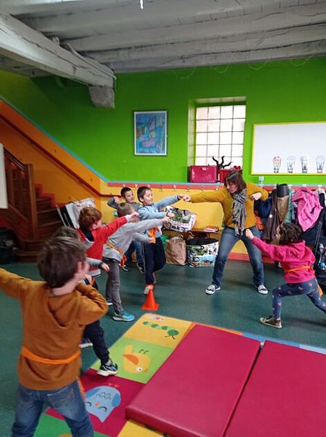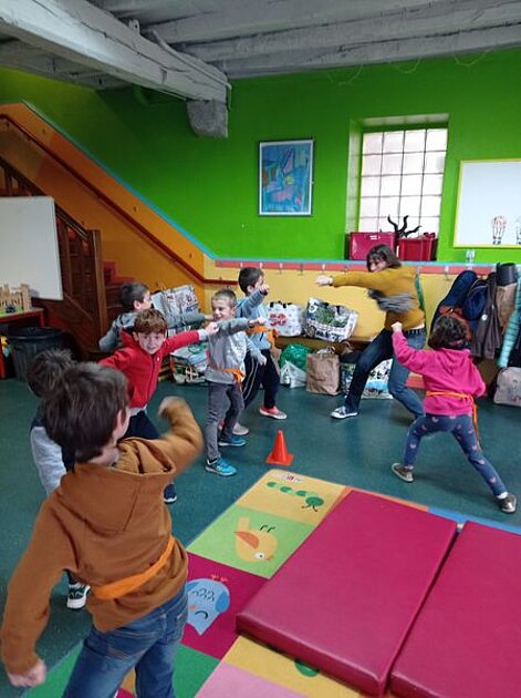 Depuis mars, nous sommes en Asie : la mascotte de la classe, le panda Kako, est partie rendre visite à ses congénères. Il nous écrit des lettres depuis la Chine, nous donne des idées d'activités ou de spectacle, nous raconte sa vie là-bas. Il nous a tous envoyé des ceintures de karaté, lui-même a pris des cours là-bas avec un maître de karaté. Nous avons donc décidé de nous y mettre aussi, et d'apprendre quelques prises de karaté à l'école.