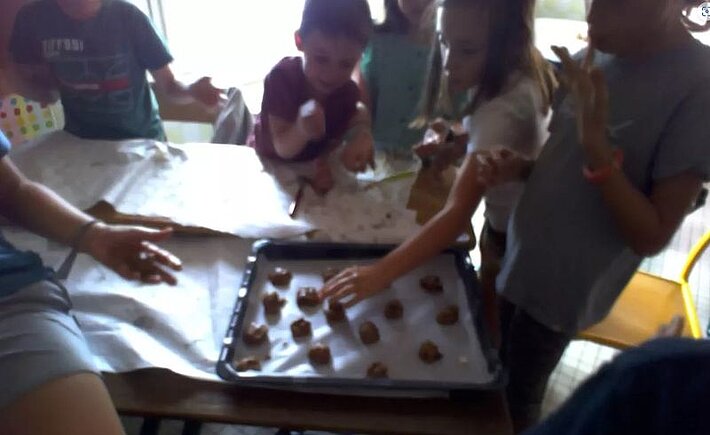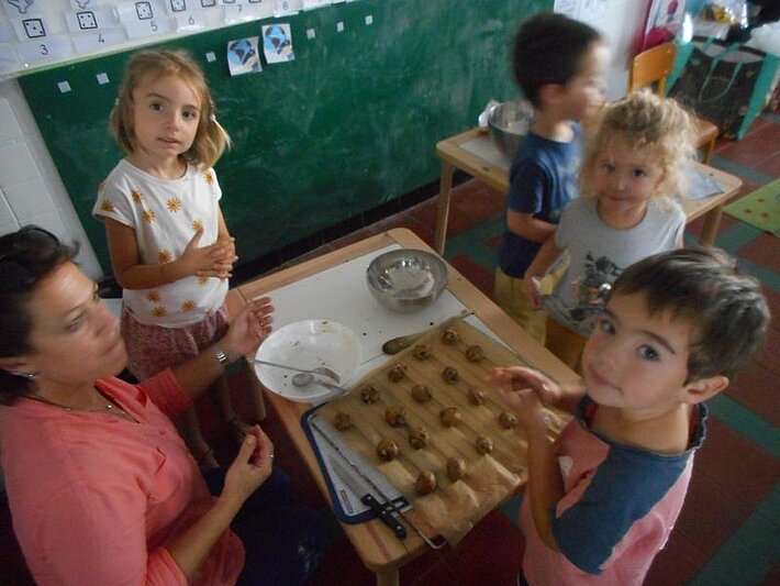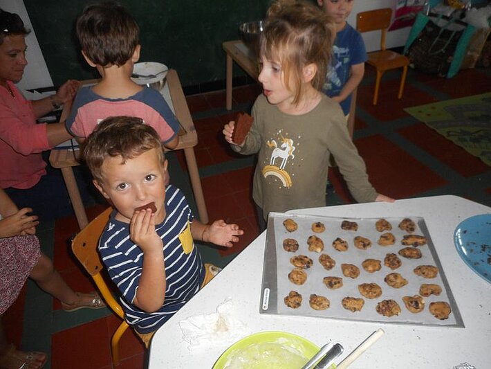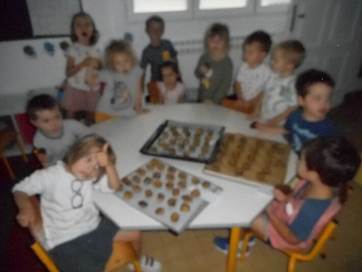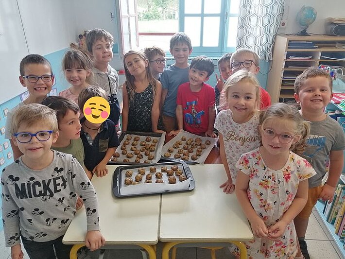 Jeudi 20 octobre, tous les enfants de l'école ont confectionné des cookies de saison : chocolat noisettes. Les oeufs et la farine ont été offerts par 2 familles (merci aux familles Cau et Hayet-Camy), ils sont produits à Larressore.