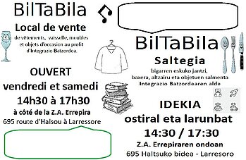 BiltaBila a ouvert sa boutique à Larresoro, en cette fin d’année 2020. Tenue par des bénévoles, cette association vend en seconde main, des vêtements, de la vaisselle, des petits meubles, des livres...à petits prix. Tous les bénéfices sont reversées à Integrazio Batzordea, association qui aide à l’inclusion des enfants porteurs de handicap au sein de Seaska.